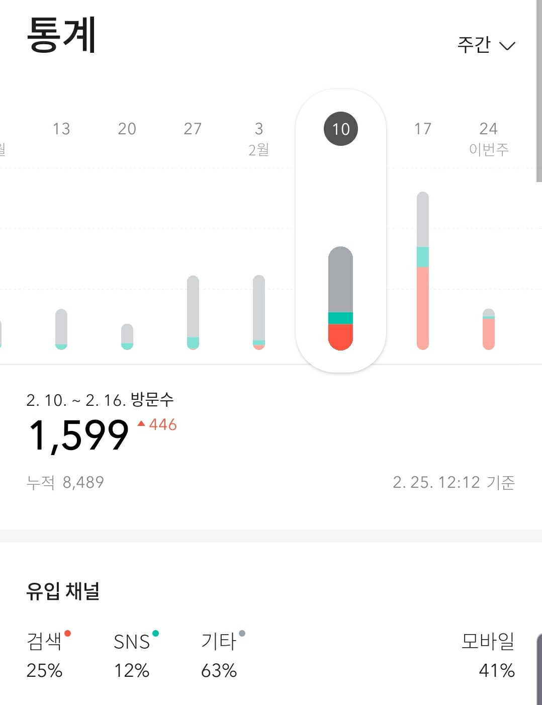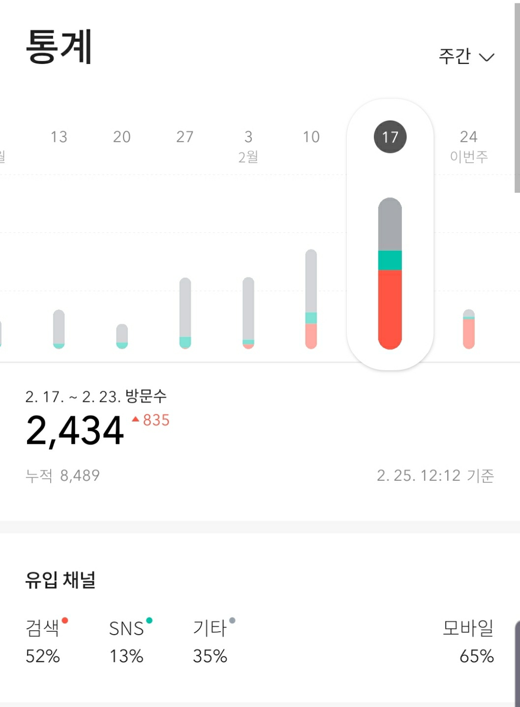 그리고 바로 저번 주에는 주간 방문자수 최고 기록을 달성하며 검색 비율이 52%입니다.